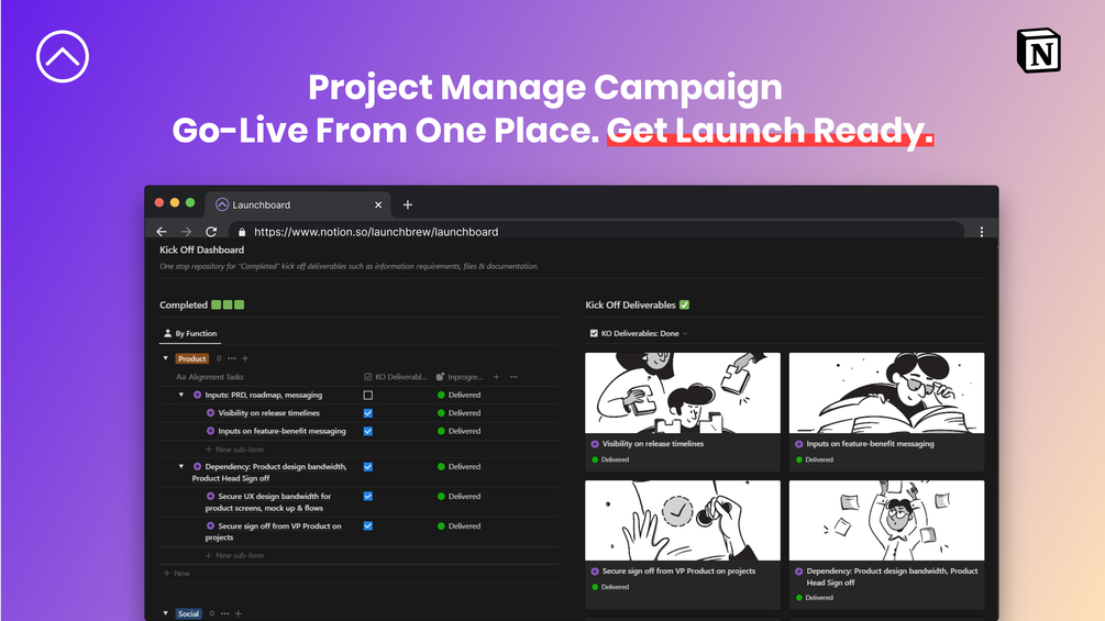 Launchboard is an automated Notion workspace, for marketers, to project manage all moving parts of a cross-functional launch at one place.